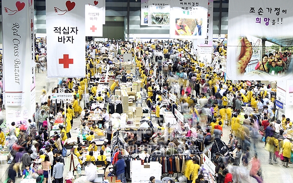 대한적십자사 취약계층돕기 기금마련 바자회가 열린 28일 오후 삼성동 코엑스 B홀에서 물건을 구입하려는 사람들로 인산인해를 이루고 있다.