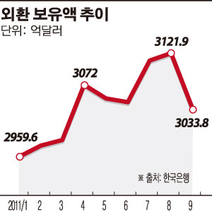 외환보유액이 감소한 것은 지난 6월 이후 3개월만이다. 하락폭으로는 세계 금융위기 때인 2008년 11월 -117억5000만달러 이후 2년10개월 만에 최대 수준이다.