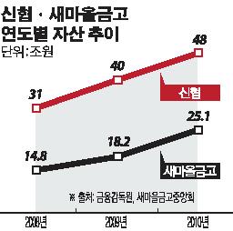 신협은 2007년 말 총자산이 27조원에서 지난해 말 48조원으로 21조원(77.8%) 급증했다. 총대출액도 18조원에서 28조원으로 10조원(55.6%) 늘었다. 새마을금고 역시 2008년 말 총자산이 14.8조원에서 지난해 말 25.1조원으로 10.3조원(69.6%) 급증했다.