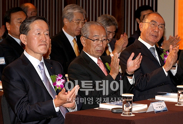 허창수 전경련 회장(왼쪽부터), 강신호 전경련 명예회장, 손길승 전경련 명예회장 등 참석 내빈들이 5일 오후 장충동 신라호텔에서 열린 2030년 세계 10대 경제강국 프로젝트 ‘미리 가본 대한민국’ 국민보고대회에 참석해 박재완 기획재정부 장관의 축사를 듣고 있다.