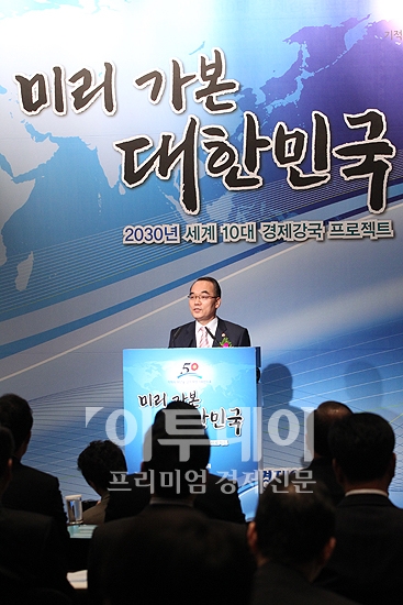 박재완 기획재정부 장관이 5일 오후 장충동 신라호텔에서 열린 2030년 세계 10대 경제강국 프로젝트 ‘미리 가본 대한민국’ 국민보고대회에 참석해 축사를 하고 있다.