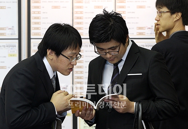 2011 KB 굿잡 중견·중소기업 취업박람회가 6일 오전 인천 송도 컨벤시아 제1전시관에서 개최됐다. 박람회장을 찾은 구직자들이 안내책자를 살펴보고 있다.