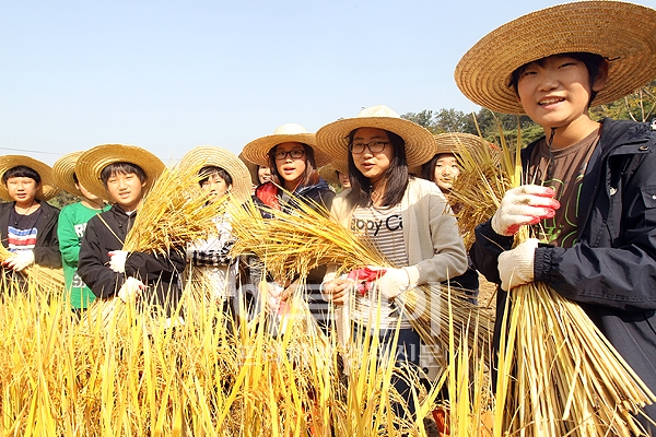완연한 가을 날씨를 보인 13일 오전 서울 강동구 둔촌동 일자산자연공원 영농체험장에서 아이들이 벼베기 체험을 하고 있다.