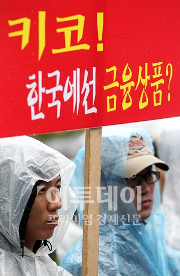 전 세계 80여개국 900개 이상 도시에서 동시에 ‘반(反) 월가’ 시위가 열리고 있는 15일 오후 여의도 금융감독원 앞에서 참가자들이 비를 맞으며 집회를 벌이고 있다.