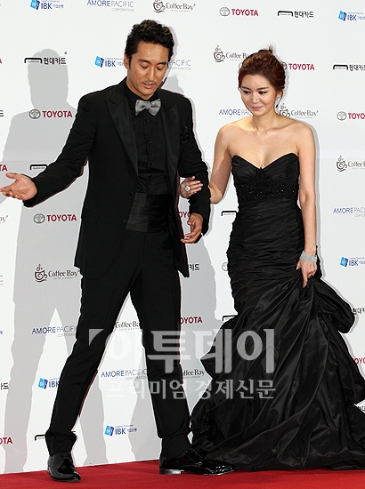 배우 신현준과 장서희가 17일 오후 세종문화회관에서 열린 제48회 대종상영화제에 입장하며 포즈를 취하고 있다.