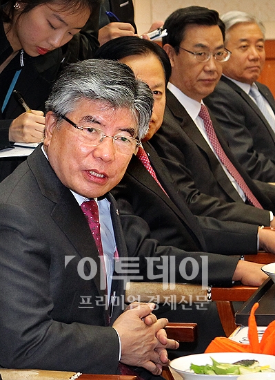김중수 한국은행 총재가 21일 오전 서울 중구 남대문로 한국은행에서 열린 ‘시중은행장들과 금융협의회’시작전 참석자들과 인사를 나누고 있다.