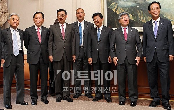 김중수 한국은행 총재가 21일 오전 서울 중구 남대문로 한국은행에서 열린 ‘시중은행장들과 금융협의회’시작전 참석자들과 이야기를 나누고 있다.