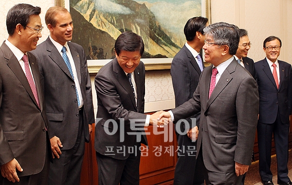 김중수 한국은행 총재가 21일 오전 서울 중구 남대문로 한국은행에서 열린 ‘시중은행장들과 금융협의회’시작전 참석자들과 인사를 나누고 있다.