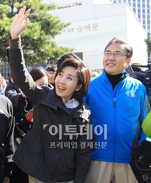 나경원 한나라당 서울시장 후보가 25일 오전 서울 남대문로 앞 거리유세에서 지나가는 시민들과 손을 흔들어 인사를 나누고 있다.