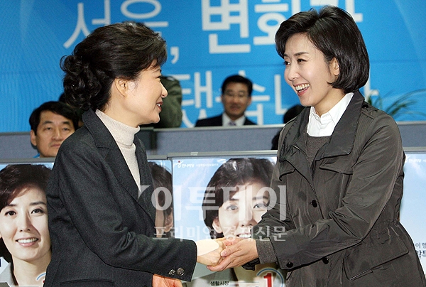 10.26 재보궐선거를 하루 앞둔 25일 오전 나경원 한나라당 서울시장후보의 선거사무실을 찾은 박근혜 전 한나라당 대표가 나 후보와 인사를 나누고 있다.
