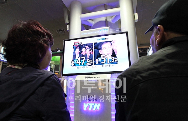 10.26 재보궐선거 투표가 끝난 26일 저녁 서울역 대합실에 설치된 TV화면에 출구조사 결과가 발표되고 있다. 출구조사결과 나경원 한나라당 후보가 47.9% 박원순 야권단일 후보가 51.9% 로 집계됐다.