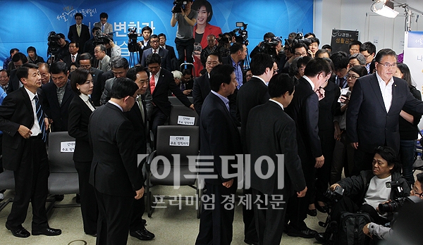 10.26 재보궐선거가 실시된 26일 저녁 서울 중구 태평로 프레스센터 나경원 후보 선거캠프에서 한나라당 당직자들이 방송3사 출구조사 결과 나경원 후보가 뒤지는것으로 나타나자 자리를 떠나고 있다.
