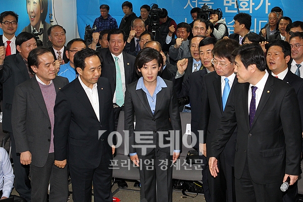 나경원 한나라당 서울시장 후보가 26일 저녁 서울 중구 태평로 프레스센터 선거캠프를 방문해 지지자들에게 감사의 인사를 전하고 있다.