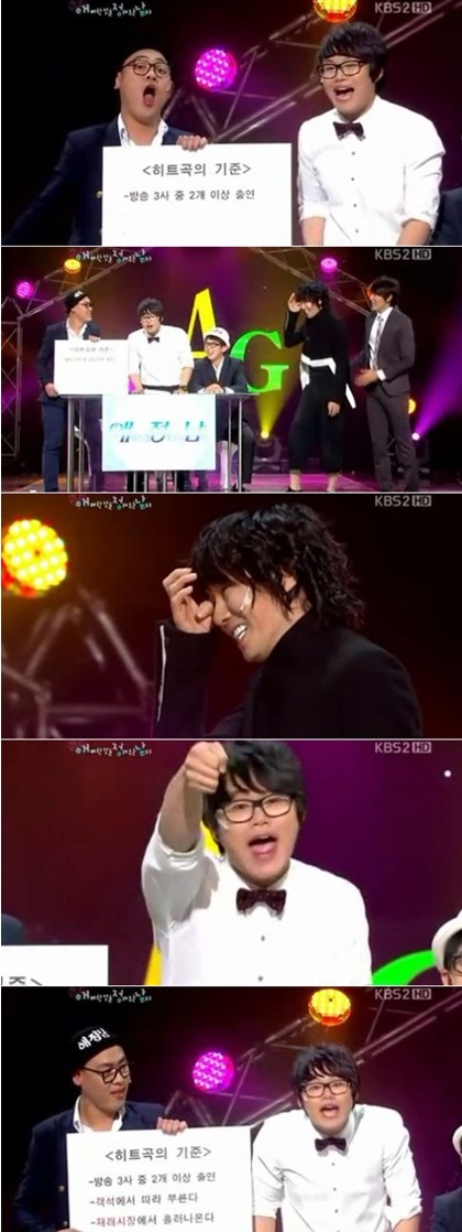 최효종은 이어 "노래를 부르다가 객석으로 넘기면 따라 불러야 한다" , "노래가 유행할때 강남, 홍대에서 흘러나오는것은 아직 히트곡이 아니다. 진정한 히트곡은 재래시장에 흘러나와야 한다. 재래시장 할머니가 노래를 따라부른다고 생각해 보라"며 다소 황당한 기준도 제시했다.