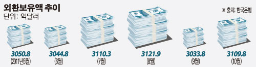 외환보유액은 지난 9월 외환시장 안정을 위한 달러 매도 개입으로 88억1000만달러가 급감했다. 하지만 두 달만에 다시 증가세로 돌아서며 사상 최고치였던 지난 8월(3122억달러) 수준에 근접했다.