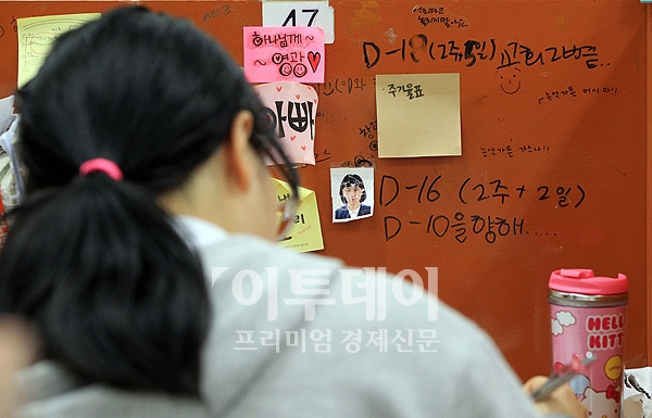 경기도 수원 창현고등학교 고3 수험생이 대학수학능력시험을 8일 앞둔 2일 저녁 마무리 학습에 열을 올리고 있다. 책상칸막이에는 D-Day 가 표시되어 있다.