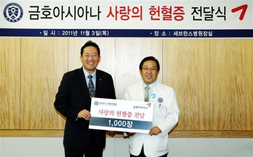 금호아시아나는 이 날 오전 신촌에 위치한 연세대학교 세브란스 어린이병원을 방문해 임직원들이 모은 헌혈증서 1000장을 기증했다.