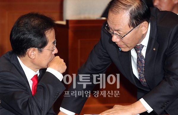 한미 자유무역협정(FTA) 국회 비준안 처리 문제로 여야 간 대치 상태가 계속되고 있는 3일 오후 국회에서 열린 한나라당 의원총회에 참석한 홍준표 대표와 황우여 원내대표가 심각하게 이야기를 나누고 있다.