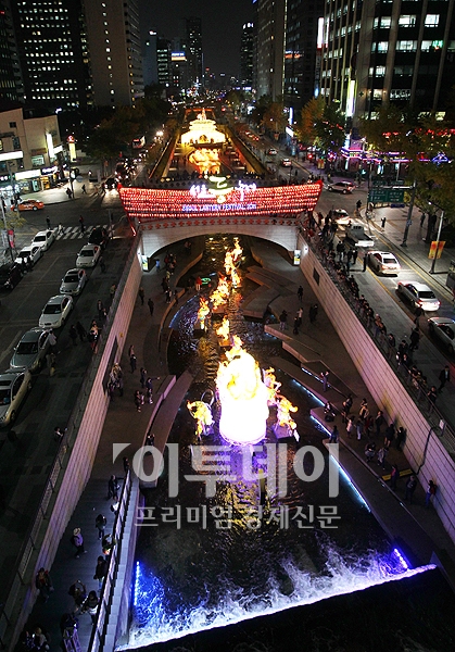 '2011 서울 등축제'를 하루 앞둔 3일 저녁 리허설에 들어간 청계천이 형형색색의 화려한 등(燈)으로 빛나고 있다. 서울시는 4일부터 17일간 축제가 이어진다고 밝혔다.