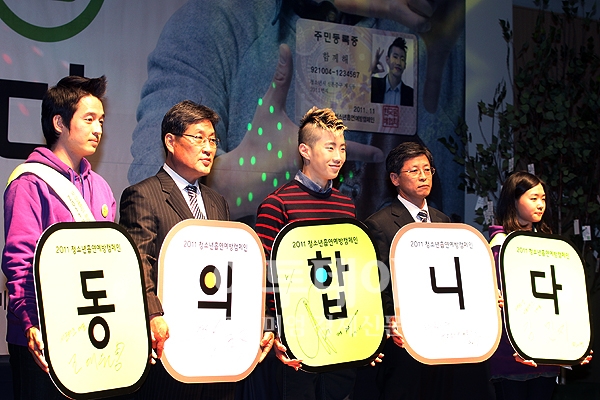 2011 청소년흡연예방캠페인 ‘신분증 확인 동의합니다 ’가 열린 4일 오후 서울 종로구 세종로 올레스퀘어에서 홍보대사로 위촉된 가수 박재범이 참석자들과 함께 기념촬영을 하고 있다.