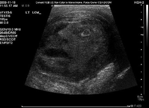 해당 사진은 고환암을 앓고 있는 45세 남성의 고환을 찍은 초음파 사진이며 사진 속 암 덩이에는 눈과 입을 크게 벌리고 있는 악마의 형상이 언뜻 보인다.