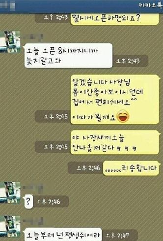공개된 사진에는 한 사장과 아르바이트생 간의 카카오톡 문자메시지 주고받은 모습이 나타났다.