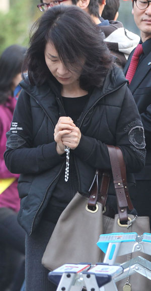 2012학년도 대학수학능력시험이 실시된 10일 오전 서울 강남구 삼성동 경기고등학교에서 한 수험생 어머니가 교문 앞에서 간절한 기도를 하고 있다