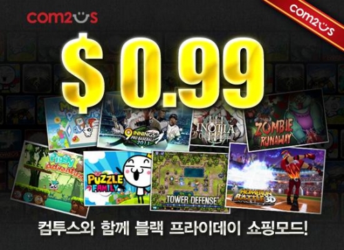 컴투스는 2011 추수감사절을 맞아 ‘블랙 프라이데이’ 세일을 실시해 주요 인기게임 11종을 0.99달러로 판매하는 이벤트를 이달 29일 오전까지 실시한다고 22일 밝혔다.