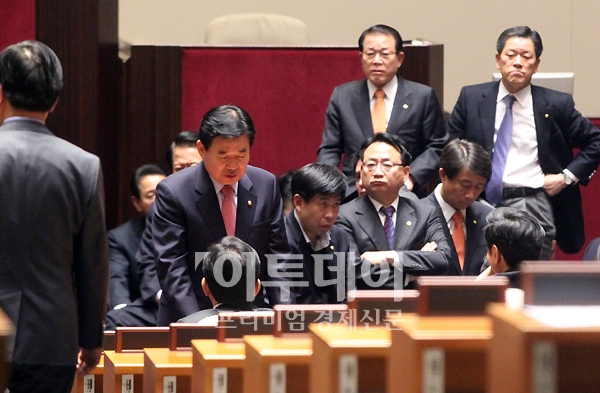 한나라당이 22일 열린 국회 본회의에서 한미 자유무역협정(FTA) 비준안을 전격 처리한 가운데 민주당 의원들이 국회 본회의장에서 대책을 마련하고 있다.