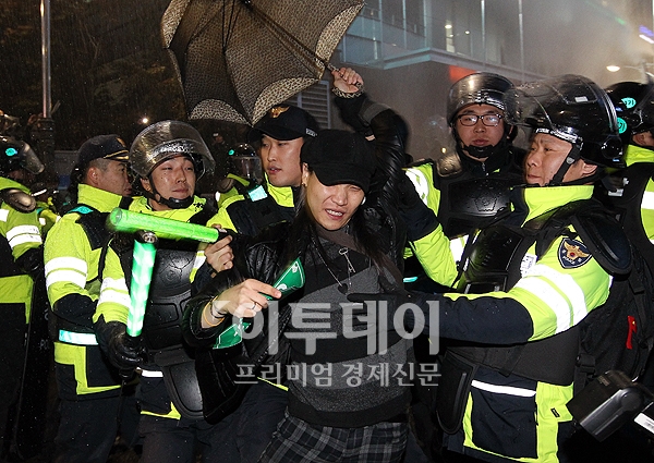 한나라당의 본회의 강행처리로 한미FTA 국회비준안이 통과된 22일 저녁 서울 명동의 한 집회참가자가 경찰에 연행되고 있다.