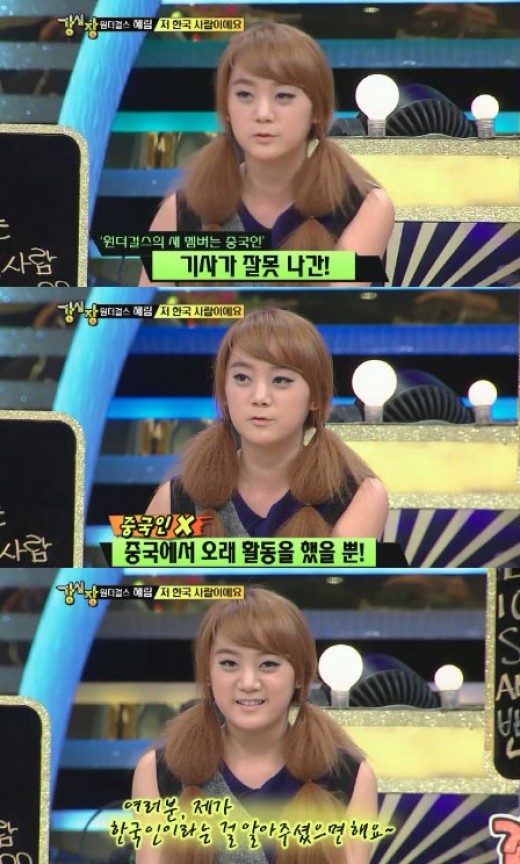 22일 SBS TV ‘강심장’에 출연한 혜림은 “전 한국인이다"라며 “‘원더걸스’에 합류할 당시 기사가 '중국인'이라고 나서 오해를 많이 하신다”고 운을 뗐다.