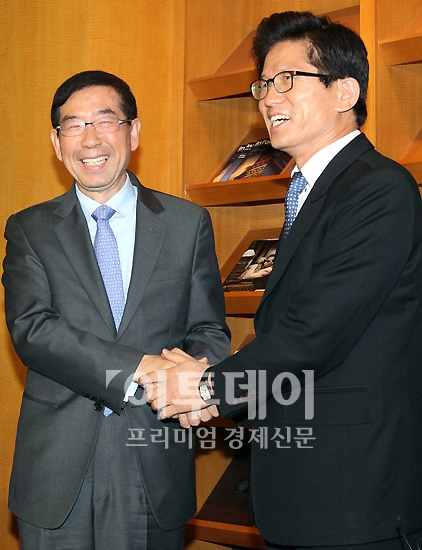 박원순 서울시장(왼쪽)과 김문수 경기도지사가 24일 오전 서울 JW 메리어트 호텔에서 조찬감담회를 갖고 악수를 나누고 있다.