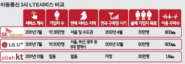 한편 KT가 LTE시장에 진입함에 따라 이통 3사간 LTE 전쟁도 본격화될 전망이다. 이미 지난 9월 말 서비스를 시작한 SK텔레콤은 현재 30만명, LG유플러스는 25만명의 가입자를 확보했다. KT는 연말까지 10만~20만명 가량의 가입자를 확보한다는 목표를 세웠다. KT는 이르면 11월말께 LTE 전략 발표회를 갖고 전국망 확대 계획 등 전반적인 서비스 전략을 발표할 예정이다.