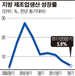 한국은행이 25일 발표한 ‘최근의 지방경제동향’에 따르면 지난 3분기 지방의 제조업 생산은 전년 동기 대비 5.6% 성장했다. 이는 지난 2009년 3분기 5.0% 성장한 이후 7분기만에 최저치다. 전분기 성장률(7.9%)보다도 크게 밑돌았다.