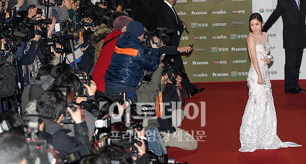 배우 민효린이 25일 저녁 서울 경희대학교 평화의전당에서 열린 '제 32회 청룡영화상(청룡영화제) 시상식'에 레드카펫 행사에서 등이 파인 시원한 드레스를 입고 포즈를 취하고 있다.