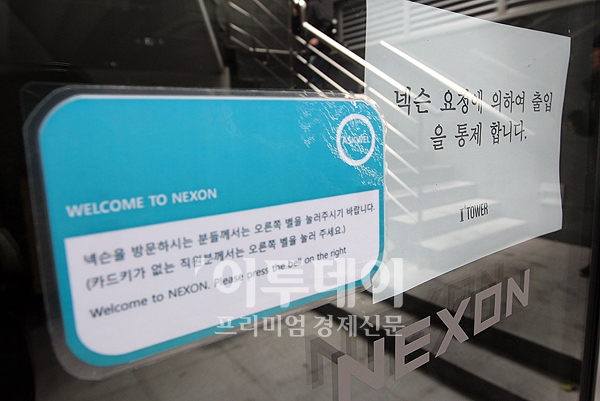 경찰 사이버수사대가 온라인 게임 업체 넥슨의 인기 게임인 메이플스토리의 백업 서버의 해킹 수사를 벌이고 있는 27일 오후 서울 역삼동 본사는 문이 굳게 닫혀있다. 넥슨은 24일 해킹사실을 확인했으며 전체회원 1,800만명 중 1,320만명의 개인정보가 유출된 사실을 밝혔다.