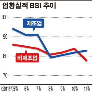 비제조업의 업황실적은 유로존 재정위기로 대외여건이 악화한 지난 9~10월 80대 초반을 유지했다. 최근 가계 이자부담이 커지면서 내수가 부진하자 70대로 하락한 것으로 풀이된다.