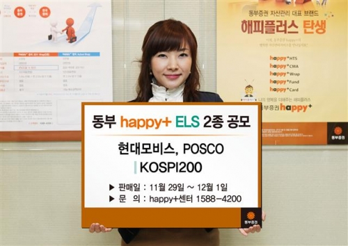 동부증권(대표이사 사장 고원종)은 오는 29일부터 12월 1일까지 얼리버드 스텝다운형 ‘동부 happy+ 파생결합증권(ELS) 제718회’와 원금보장형 ‘동부 happy+ 파생결합증권(ELS) 제719회’ 등 ELS 2종 판매한다고 28일 밝혔다.