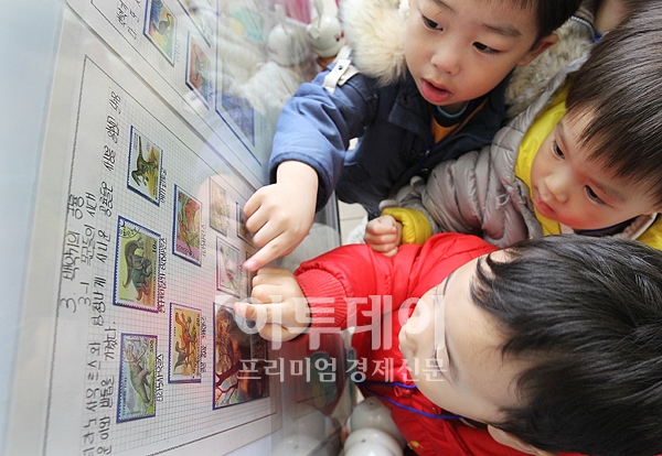 서초구청이 주관하고 서초우체국이 후원한 '취미우표 작품 전시회'가 28일 오전 서울 서초구청로비에서 열렸다. 이날 전시회를 찾은 어린이들이 선생님의 설명을 들으며 우표를 신기한듯 바라보고 있다.