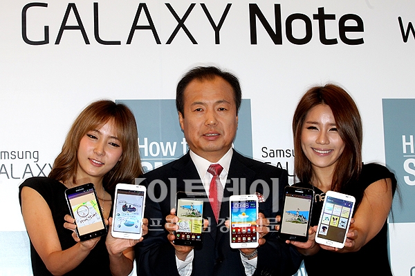 삼성전자는 28일 오전 서초사옥 다목적홀에서 전략 스마트 기기 출시 기념 미디어 행사를 열고 ‘갤럭시 노트·갤럭시 넥서스·갤럭시탭 8.9LTE’ 를 선보였다. 삼성전자 무선사업부장 신종균 사장(가운데)이 모델들과 함께 신제품을 들고 포즈를 취하고 있다.