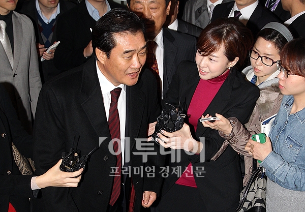 유경선 유진그룹회장이 30일 오전 서울 강남구 대치동 하이마트 본사에서 열린 임시주주총회를 마치고 기자들의 질문을 받으며 본사를 나서고 있다. 유 회장은 임시주총을 통해 이사에 재선임 됐다.