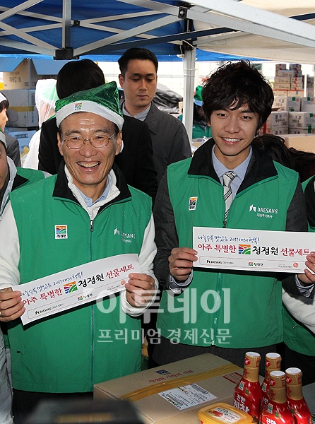 박성칠 대상(주) 대표이사(왼쪽)와 가수 이승기가 30일 오후 서울 동대문구 신설동 대상(주) 사옥에서 열린 결식아동들을 위한 '나눌수록 맛있는 행복!' 이라는 주제의 나눔행사에서 선물포장을 하며 즐거운 표정을 지어 보이고 있다.
