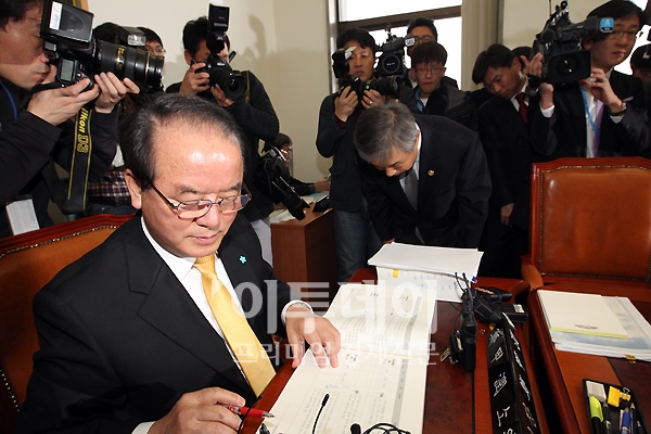 이현동 국세청장이 2일 오전 국회 예산결산특별위원회 계수조정소위 심사를 마치고 정갑윤 예결위원장에게 인사를 하고 있다.