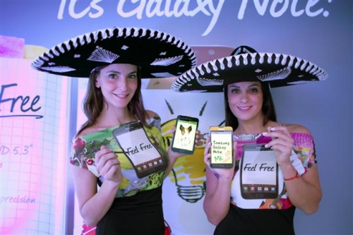 삼성전자는 1일(현지시각) 멕시코시티 센트럴 아트 프로젝트홀에서 갤럭시 노트론칭 행사를 열고 중남미 프리미엄 스마트기기 시장 공략에 나선다고 밝혔다. 사진은 모델들이 신개념 스마트 기기 '갤럭시 노트'를 소개하는 모습.