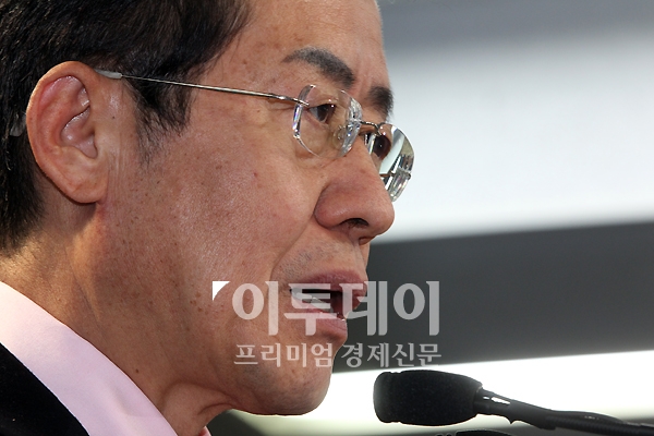 한나라당 홍준표 대표가 8일 오후 여의도 한나라당 당사에서 기자회견을 갖고 취재진의 질문에 답하고 있다.
