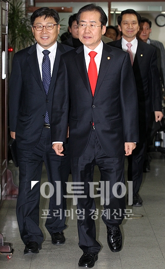 홍준표 한나라당 대표가 9일 오후 여의도 한나라당 중앙당사에서 당 대표로 선출된지 5개월여 만에 대표직에서 물러나겠다고 공식 발표하기 위해 들어서고 있다.