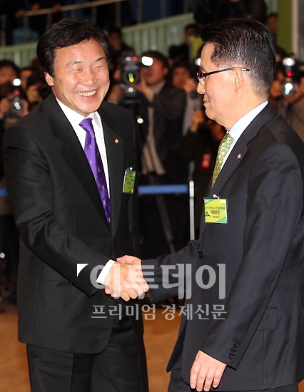 박지원 전 원내대표가 11일 오후 송파구 잠실실내체육관에서 개최된 민주당 임시전국대의원대회에서 통합을 반대한 발언을 한 후 손학규 대표와 악수를 나누고 있다.