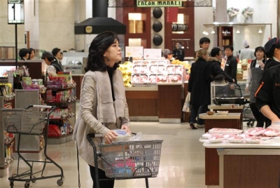 ▲호텔신라 이부진 사장이 11일 오전 서울 신세계백화점 본점 지하 1층 식품 코너에서 직접 카트를 끌며 다양한 식재료들을 쇼핑, 눈길을 끌고 있다. 이 사장은 시식코너에서 아이가 먹을 것을 사달라고 조르자 안된다며 얼굴을 찌푸리는 등 여느 주부와 같은 모습을 보이기도 했다. 사진=연합뉴스.