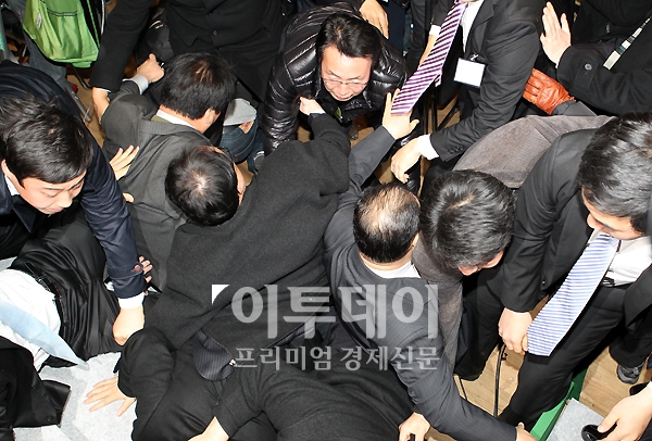 야권 통합을 결의하기 위한 민주당 임시전국대의원대회가 11일 오후 송파구 잠실실내체육관에서 개최됐다. 투표가 끝난 후 통합에 반대하는 당원들이 개표 결과를 발표할 것을 요구하며 단상 앞으로 향하자 이를 저지하는 관계자들과 몸싸움을 벌이다 바닥에 나뒹굴고 있다.