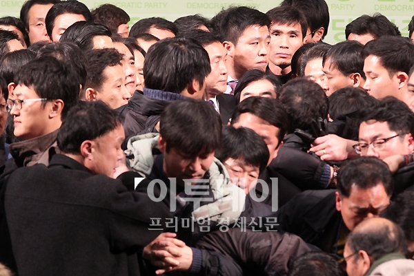 민주당 야권통합안이 11일 오후 송파구 잠실실내체육관에서 진행된 임시전국대의원대회를 거쳐 가결됐다. 민주당 손학규 대표가 관계자들에 둘러싸여 행사장을 빠져나가고 있다.